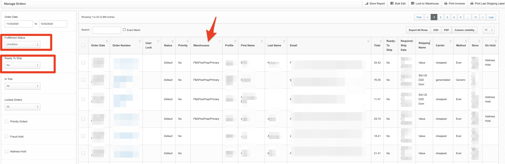 - Click "Warehouses" column to sort such that Warehouse = FBAFlexPrep appears at the top. (Shiphero has an issue with the Warehouse filter so it does not work and this is the workaround solution.)