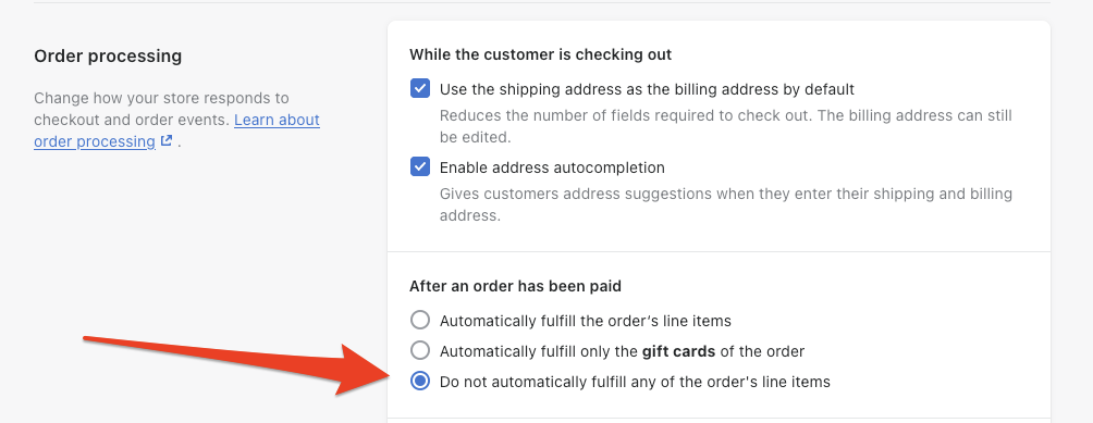 Shopify Integration Settings CONFIGURE SHOPIFY FULFILLMENT SETTINGS (To disable Shopify from marking orders fulfilled automatically) GO TO: shopify.com/admin/settings/checkout